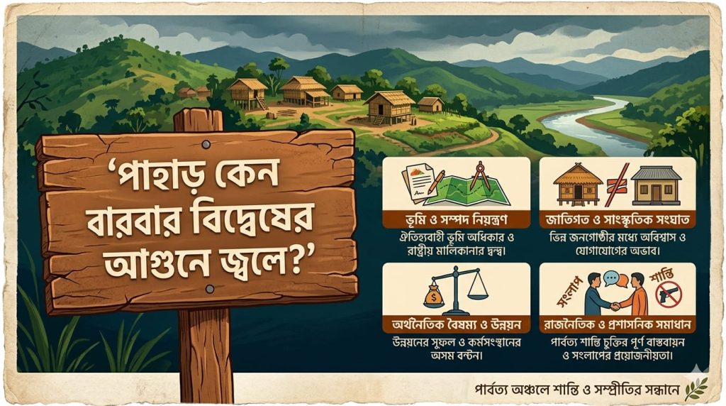 রাঙামাটি, খাগড়াছড়ি ও বান্দরবান- এই তিন পার্বত্য জেলা নিয়ে গঠিত পার্বত্য চট্টগ্রাম বাংলাদেশের মানচিত্রে যেমন আলাদা বৈশিষ্ট্য ধারণ করে, তেমনি সামাজিক ও রাজনৈতিক বাস্তবতায়ও এটি এক জটিল ও গুরুত্বপূর্ণ অধ্যায়। পাহাড়, নদী, বন এবং নানা জাতিগোষ্ঠীর সহাবস্থান- সব মিলিয়ে এটি যেন এক জীবন্ত বৈচিত্র্যের প্রতিচ্ছবি। কিন্তু একই সঙ্গে এটি বারবার উত্তেজনা, সংঘাত ও অবিশ্বাসের আবর্তে পড়ে যায়। তাই প্রশ্ন জাগে- পাহাড় কেন বারবার বিদ্বেষের আগুনে জ্বলে?