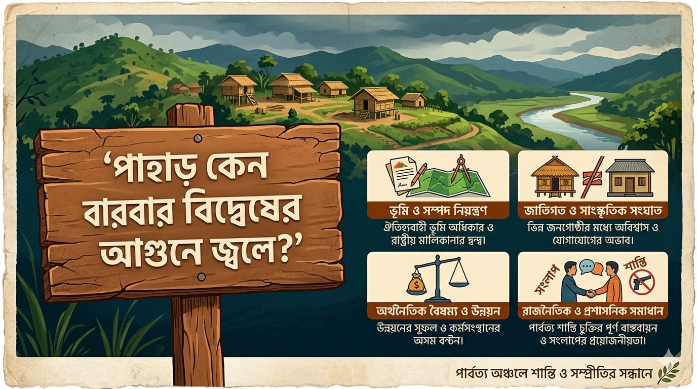 ঐতিহাসিক প্রেক্ষাপট- আস্থাহীনতার শেকড়: পার্বত্য চট্টগ্রামের সমস্যা বোঝার জন্য ইতিহাস জানা অত্যন্ত গুরুত্বপূর্ণ। ব্রিটিশ শাসনামলে এই অঞ্চলকে আলাদা প্রশাসনিক কাঠামোর মধ্যে রাখা হয়, যেখানে স্থানীয় জনগোষ্ঠীর সামাজিক ও সাংস্কৃতিক জীবনধারা ছিল তুলনামূলকভাবে স্বতন্ত্র। সেই সময় থেকেই এই অঞ্চল একটি ভিন্নধর্মী শাসন কাঠামোর মধ্যে পরিচালিত হয়ে আসছে। স্বাধীনতার পর বাংলাদেশ রাষ্ট্র গঠনের প্রক্রিয়ায় এই অঞ্চলের প্রশাসনিক কাঠামোয় পরিবর্তন আসে। তবে এই পরিবর্তন অনেকের মধ্যে অনিশ্চয়তা ও উদ্বেগ সৃষ্টি করে। ১৯৭০ ও ১৯৮০ এর দশকে সংঘাতপূর্ণ পরিস্থিতি এই আস্থাহীনতাকে আরও গভীর করে তোলে। পরে ১৯৯৭ সালের পার্বত্য চট্টগ্রাম চুক্তি (পার্বত্য চট্টগ্রাম শান্তিচুক্তি) একটি গুরুত্বপূর্ণ পদক্ষেপ হলেও এর বাস্তবায়ন নিয়ে দীর্ঘদিন ধরে মতপার্থক্য ও বিতর্ক চলমান। এই দীর্ঘ ইতিহাসের ফলস্বরূপ, অনেক ক্ষেত্রে রাষ্ট্র ও স্থানীয় জনগণের মধ্যে আস্থার ঘাটতি তৈরি হয়েছে। এই আস্থাহীনতাই অনেক সময় বিভিন্ন উত্তেজনার মূল ভিত্তি হিসেবে কাজ করে।