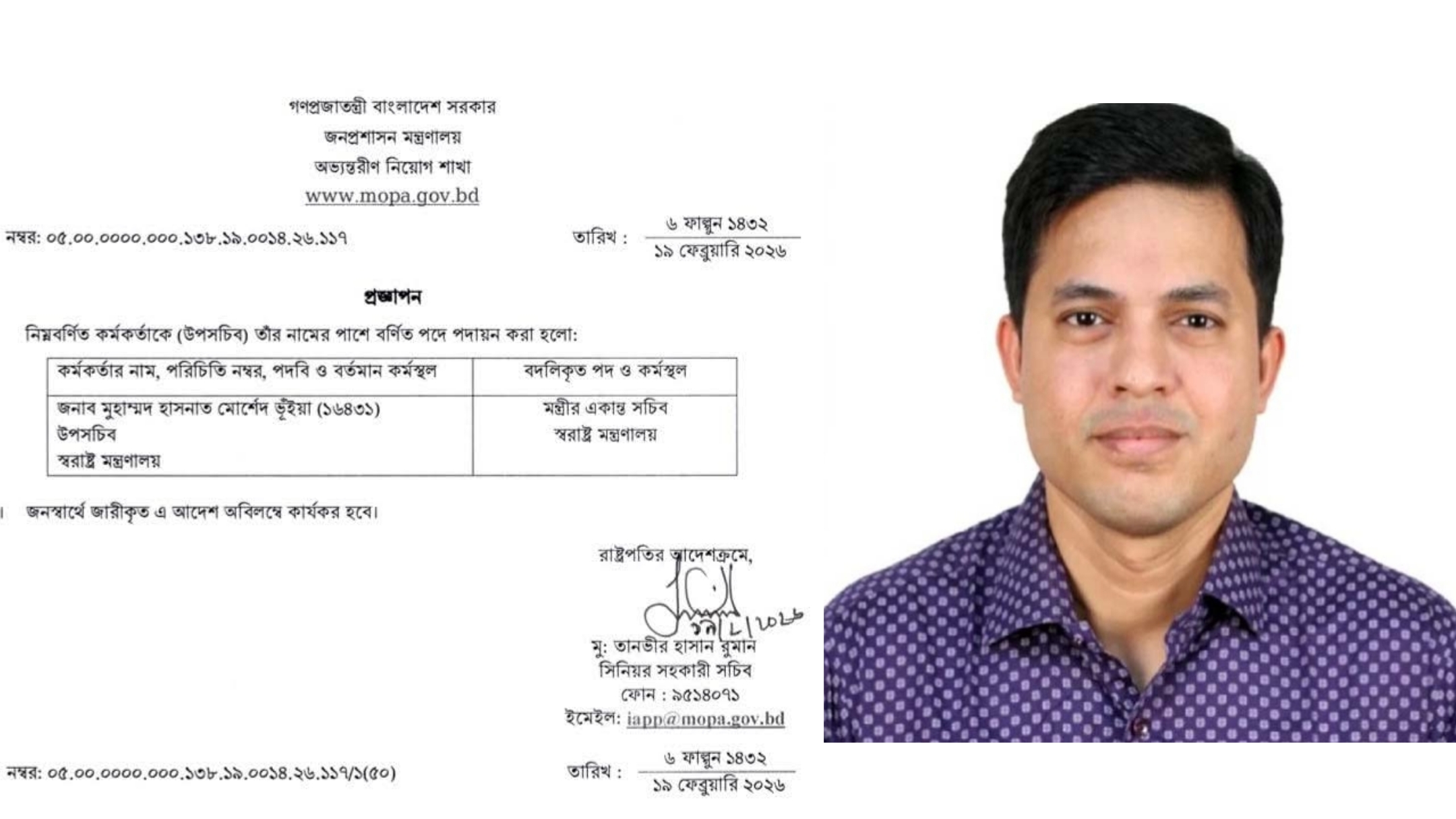 বৃহস্পতিবার (১৯ ফেব্রুয়ারি) জনপ্রশাসন মন্ত্রণালয়ের এক অভ্যন্তরীণ নিয়োগ শাখার প্রজ্ঞাপনে এই তথ্য নিশ্চিত করা হয়েছে।