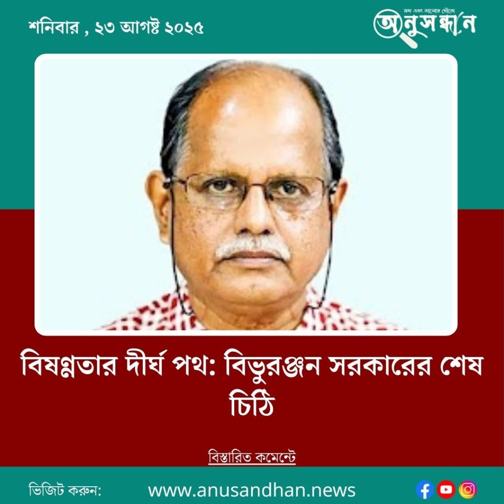 ঢাকা মুন্সীগঞ্জের গজারিয়ায় মেঘনা নদী থেকে প্রবীণ সাংবাদিক বিভুরঞ্জন সরকারের (৭১) মরদেহ উদ্ধারের পর তার লেখা একটি আবেগঘন চিঠি সামনে এসেছে, যা ব্যাপক আলোচনার জন্ম দিয়েছে। দৈনিক আজকের পত্রিকার জ্যেষ্ঠ সহকারী সম্পাদক হিসেবে কর্মরত এই সাংবাদিকের লেখাটি তার নিখোঁজ হওয়ার পর একটি অনলাইন পোর্টালে প্রকাশিত হয়। চিঠির ফুটনোটে তিনি এটিকে ‘জীবনের শেষ লেখা’ হিসেবে উল্লেখ করেছিলেন।